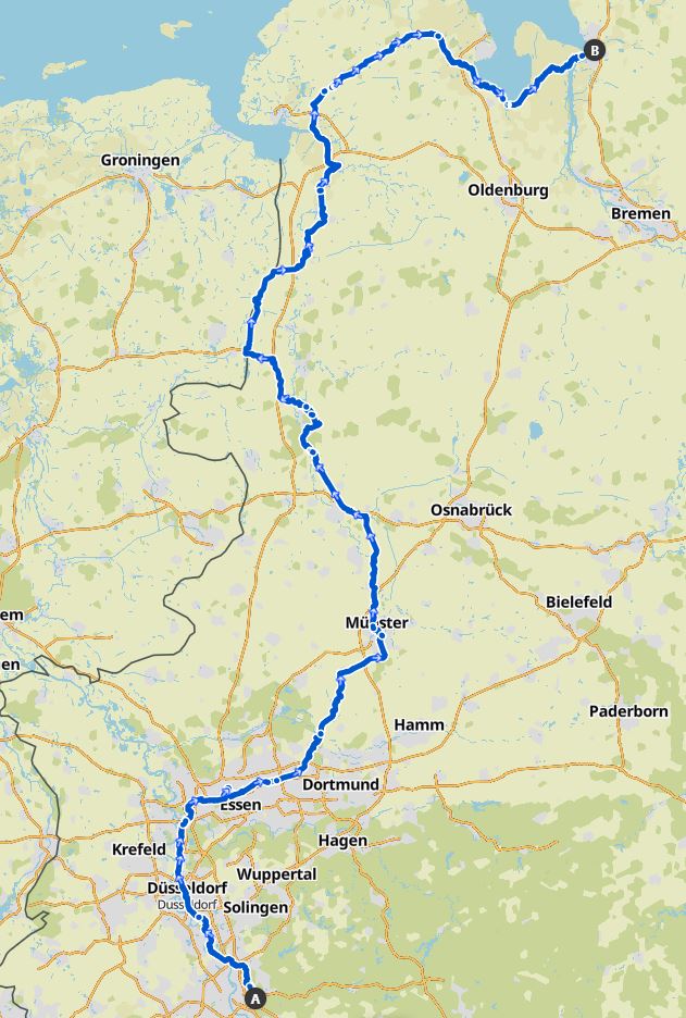 Und das soll die erste Etappe werden. Vom 10. April bis Ostersonntag von Köln durchs Ruhrgebiet nach Münster und mit einem Abstecher in die Niederlande übers Emsland und Ostfriesland bis nach Bremerhaven. Von da geht‘s mit dem Zug wieder nach Hause.