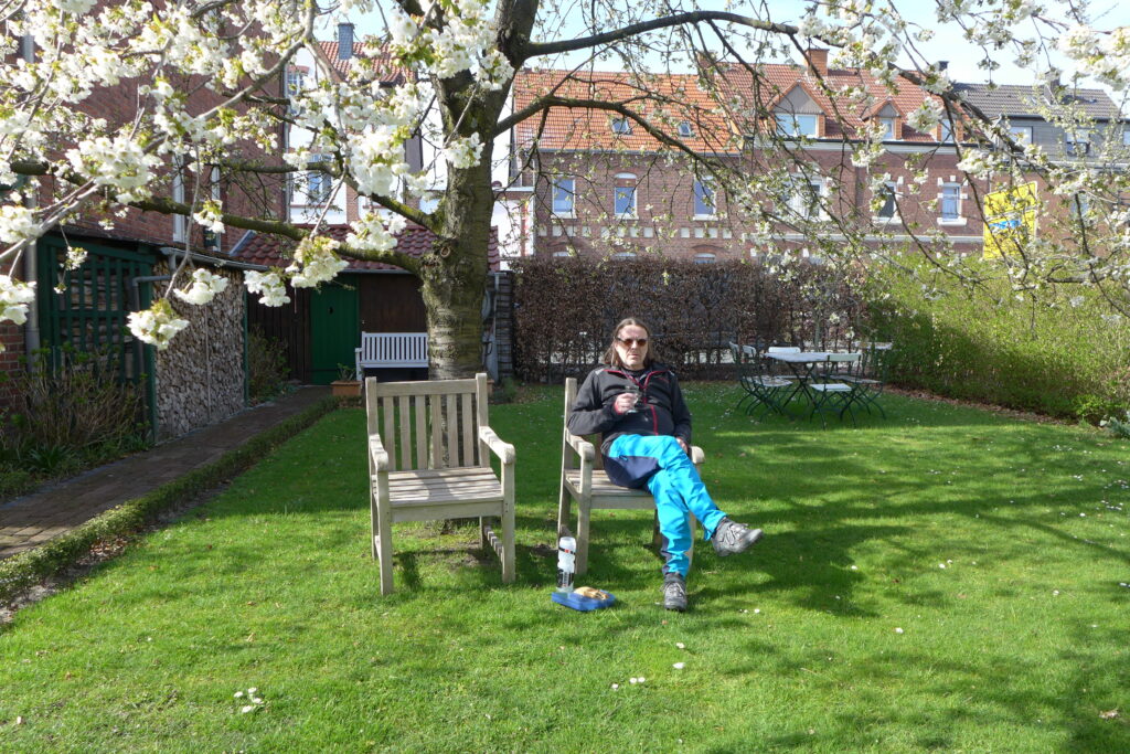 Zu guter letzt erwartet mich ein herrlicher Garten mit einem blühenden Apfelbaum. Nach etwa 85 km bei bestem Radlerwetter erst mal durchschnaufen.