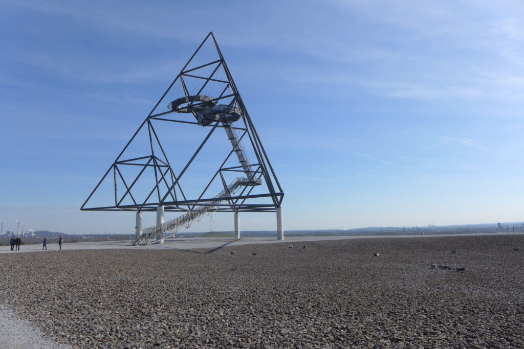 Weil die Städte im Ruhrgebiet dicht an dicht liegen, waren wir um halb elf schon durch Duisburg, Oberhausen, Essen und Bottrop geradelt und in Bottrop sollte dann auch die erste (und wahrscheinlich einzige) Bergwertung der ganzen Woche auf uns warten, der Aufstieg zum Tetraeder. Wie man auf dem Foto erkennen kann, befinden wir uns hier bereits über der Baumgrenze, man spricht auch vom Mont Ventoux des Nordens.