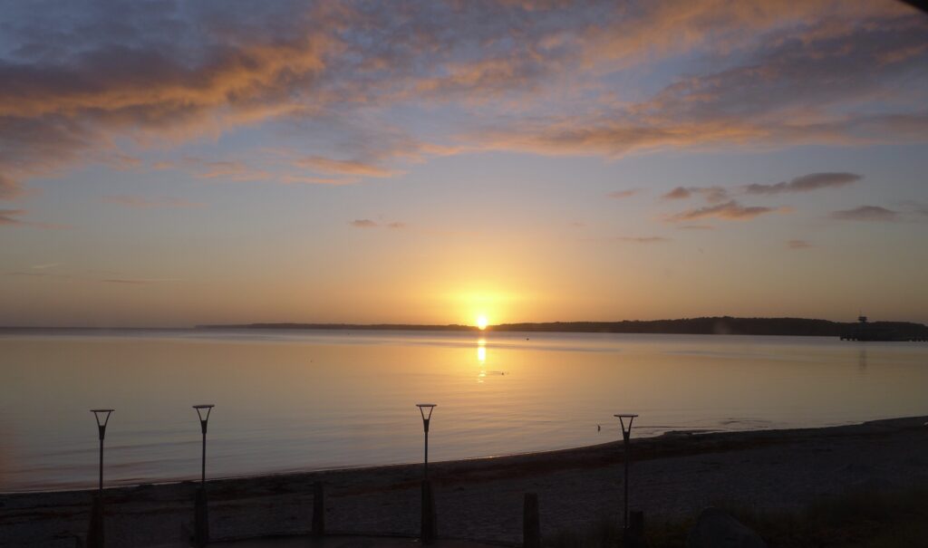 Heute gab es noch eine recht kurze Strecke nach Kiel zu fahren. Von dort wollte ich dann mit dem Zug wieder nach Köln zurück. Der Tag startete gut mit einem herrlichen Sonnenaufgang über der Ostsee.