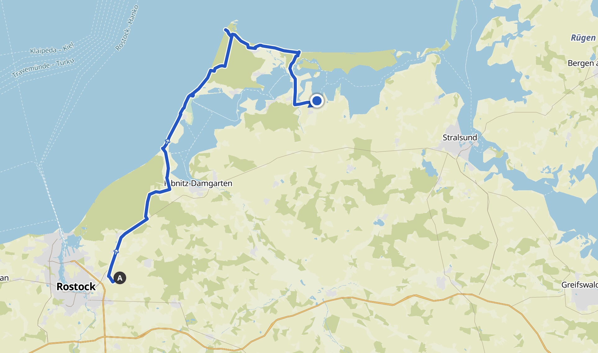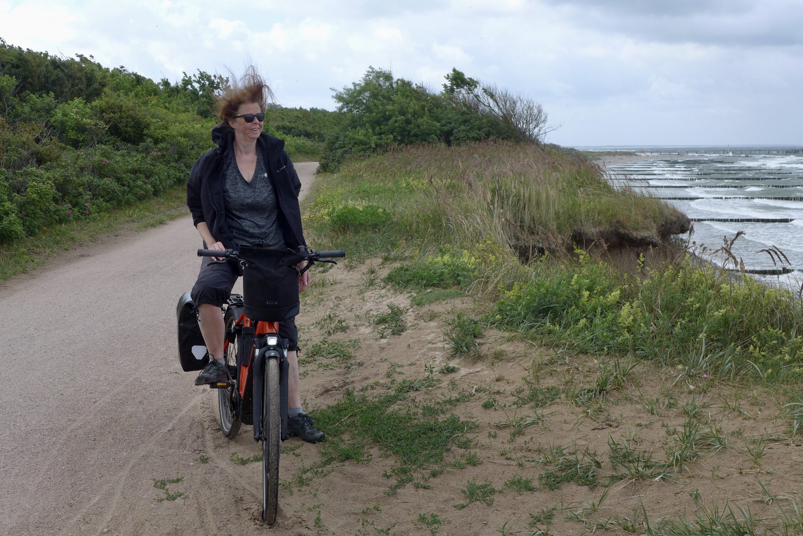 Dagegen kann der Weg über die komplette Halbinsel Fischland – Darß – Zingst – fast durchgehend autofrei, oft asphaltiert und nah am Meer – das Radlerherz erfreuen. Und wenn heute der Regen auch häufig drohte, ist doch der Wind unser Freund.