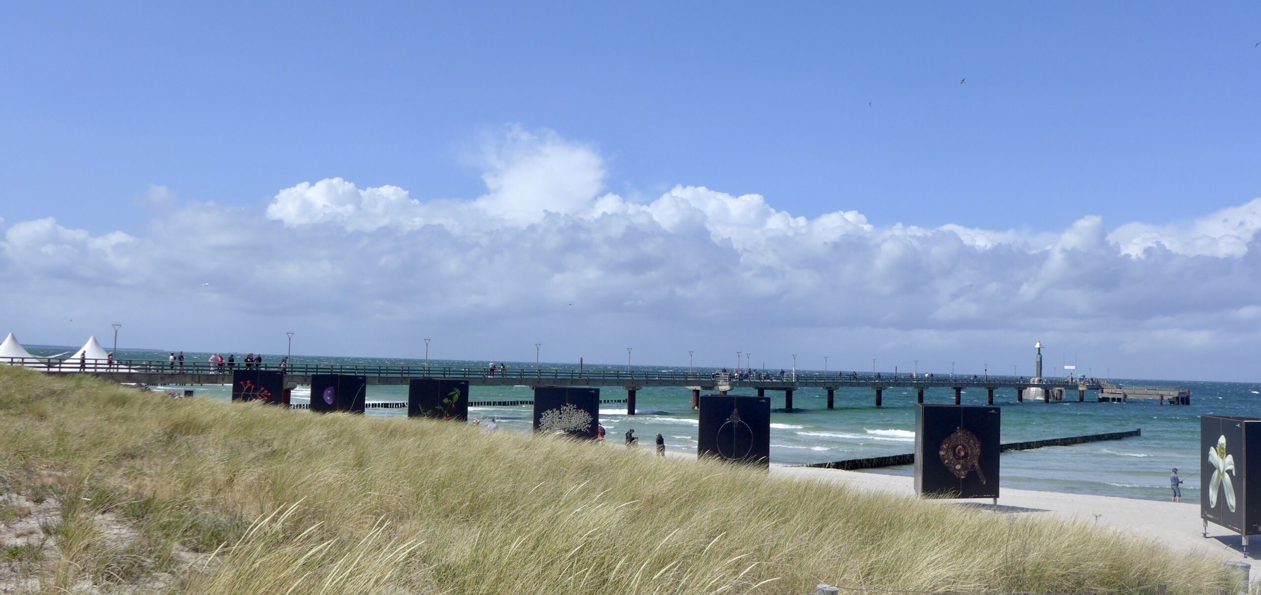 Nach dem Regen gestern war das Wetter heute durchwachsen angekündigt, aber es ist dann noch besser. Den einzigen Regenschauer des Tages erleben wir in Ahrenshoop, und da können wir uns prima unterstellen.