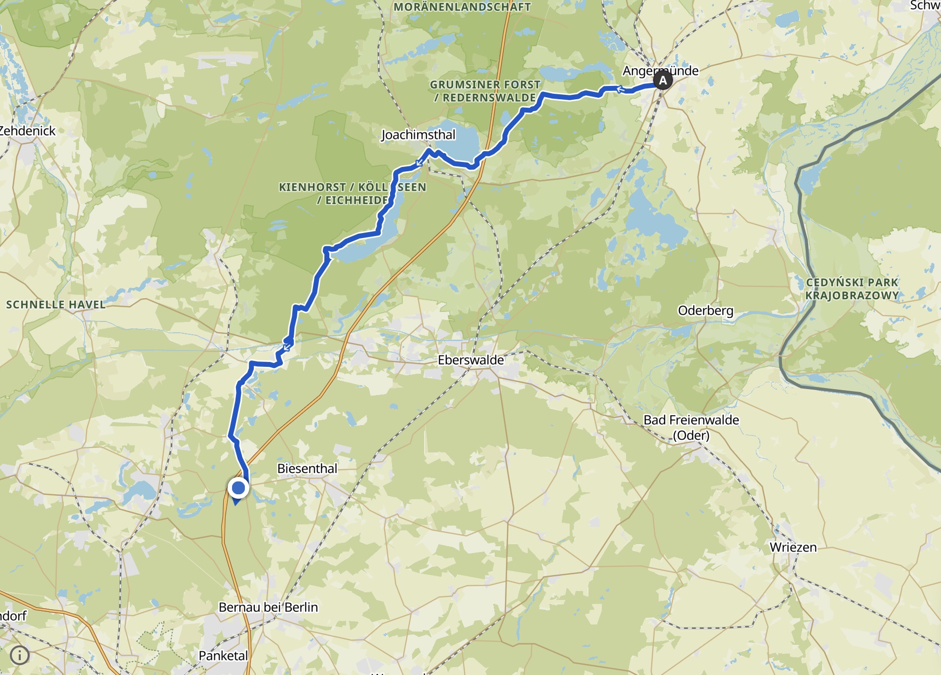 Zu Beginn bleiben wir zunächst noch in der Uckermark und passieren viel freie Fläche und den Naturpark Grumsin. Bewohnt ist das Gebiet weiterhin kaum oder gar nicht.