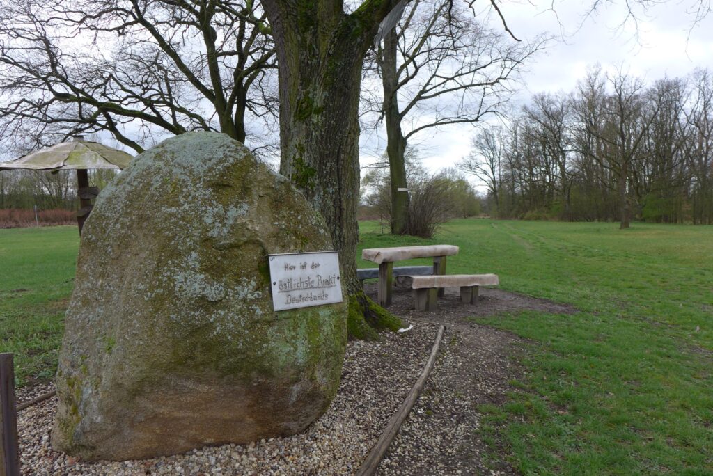 Das erste Ziel ist ein Geographisches, nämlich der östlichste Punkt Deutschlands. Der ist etwas abseits von Straßen und Wegen nur über sehr matschige Trampelpfade zu erreichen und es mangelt ihm auch ein wenig an Eleganz. Da hilft auch das Tischtuch auf der Bierbank nicht. Trotzdem muss man natürlich da gewesen sein.