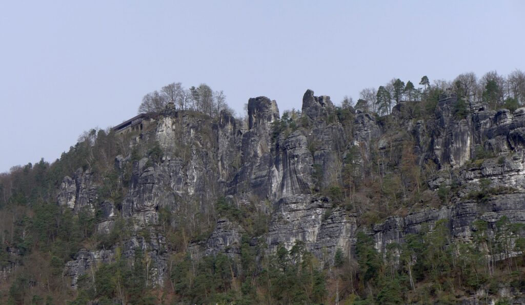 Kurz danach passiert man den bekanntesten Spot der sächsischen Schweiz, die Bastei samt Brücke. Fototechnisch war heute wegen Saharasand nicht viel drin und die Felsen wirken von unten zwar imposant, aber noch lange nicht so wie die Schlange an der Fähre zur anderen Seite.