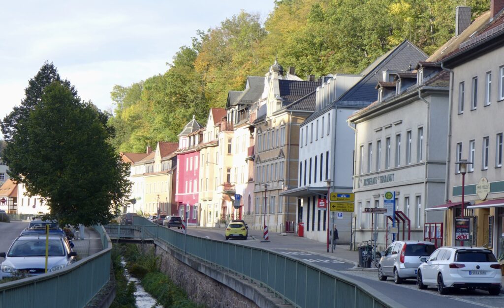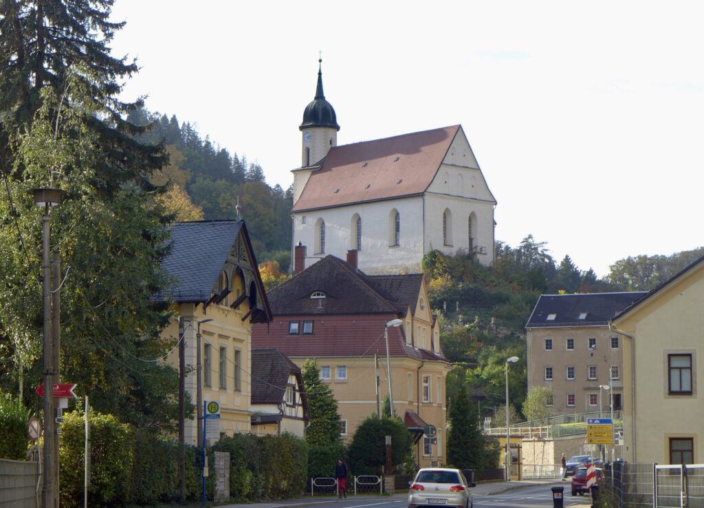 Dann geht es raus aus Dresden in den Landkreis Sächsische Schweiz – Osterzgebirge. Ich radle an der Weißeritz entlang durch Freital und Tharant. Das enge Tal präsentiert sich einerseits in farbenfroher Herbsttönung, andererseits aber etwas in die Jahre gekommen mit dominanter Landstraße und viel Leerstand. Mit dem richtigen Blickwinkel erwischt man aber das ein oder andere nette Kirchlein und leuchtende Häuser in Abendsonne.