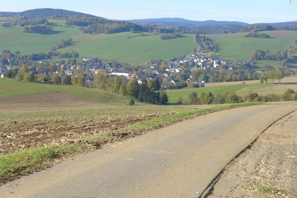 Nach Annaberg werde ich wohl nicht mehr fahren. Ich habe ja gestern schon mein Leid mit schlechter Radinfrastruktur geklagt und so geht es heute morgen weiter. Auf dem ersten Kilometer verliere ich schon etwa 50 Höhenmeter auf Kopfsteinpflaster. Da hat man nichts von, gar nichts. Man hängt nur an der Bremse und flucht, weil die Abfahrt nur aus von Steigungen geliehener Höhe besteht. Das Resultat folgt unmittelbar, es geht 150 Meter hoch. Allerdings, und da möchte ich jetzt das westliche Erzgebirge mal ausdrücklich loben, führt meine Route heute nur sehr wenig über Landstraßen, sondern viel über Felder und ausgewiesenen Radstrecken. Hügelig bis bergig bleibt es trotzdem.