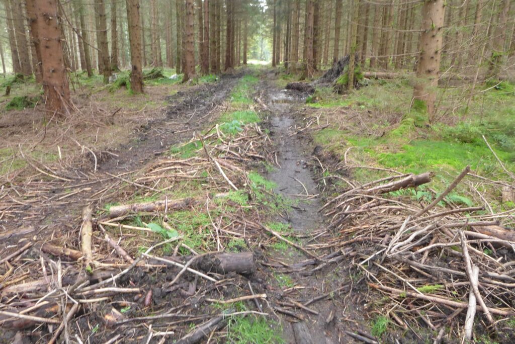 Ein Stück weiter führt die Route wieder in den Wald und das muss er geahnt haben, der Schlingel. Ich fahre eine Weile vor mich hin, erhole mich noch von den schon abgerissenen Höhenmetern und dann das. Er war schon da mit seinem Bagger!