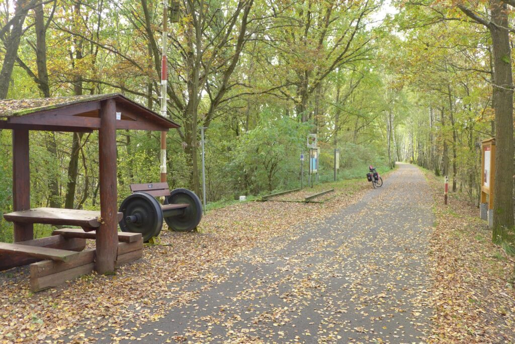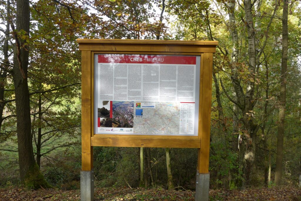 Aus Cheb raus gelangt man so wie rein, über gut ausgebaute Radrouten. Auf der ehemaligen Bahntrasse von Eger nach Marktredwitz und Wiesau ist ein Radweg in tadellosem Zustand entstanden. Leider nur auf tschechischer Seite. Dies wird schon am Grenzübergang am Zustand der Infotafeln deutlich.