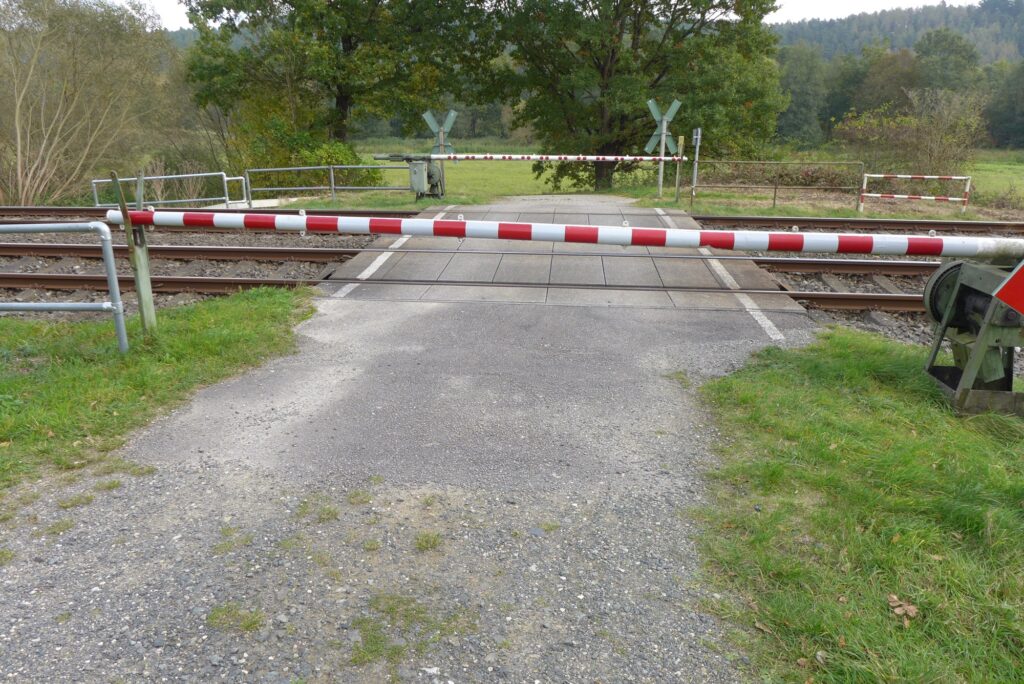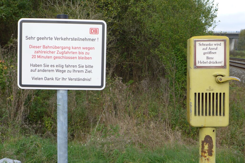 Irgendwann stehe ich vor dieser geschlossenen Schranke, die offensichtlich immer unten ist. Die Aufforderung, sich zu melden, wenn man rüber möchte, verbunden mit der Warnung, dass es bis zu 20 Minuten dauern könnte, hat wohl schon viele dazu gebracht, einfach an der Schranke vorbei zu gehen, da ist schon ein richtiger Trampelpfad. Auch ich nutze den dann. Anschließend fahre ich noch einige Zeit neben der Bahnlinie her, ein Zug ist da nicht gekommen. Ob es da nicht eine normale Schranke tun würde.
