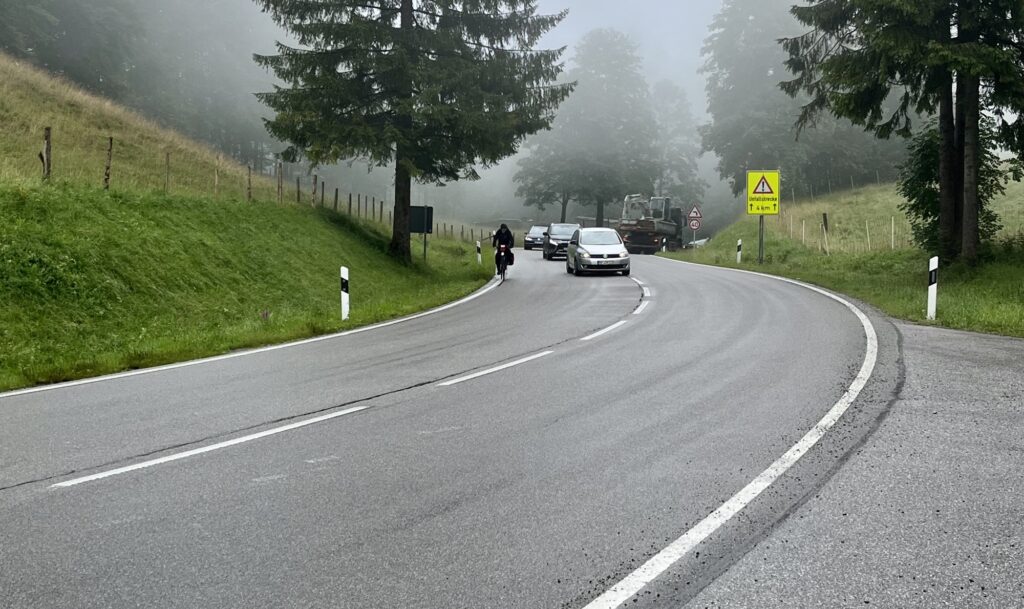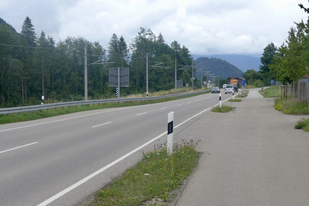 Hinter dem Kloster nimmt der Verkehr deutlich ab, es wird ruhiger und ruhiger. So richtig verschnaufen ist trotzdem nicht, denn es geht weitere 300 Höhenmeter mit mäßiger Steigung hinauf bis zum Ammersattel auf 1115 Meter. Und zack, sind wir auch schon wieder in Österreich. Der Blick auf einen hohen Gipfel ist auch hier nicht drin.