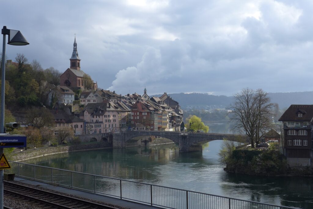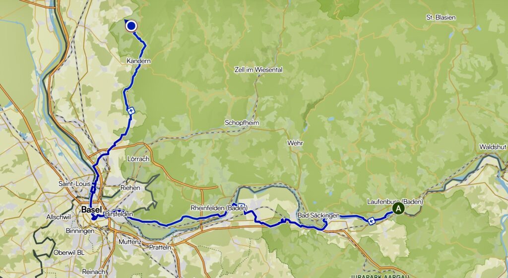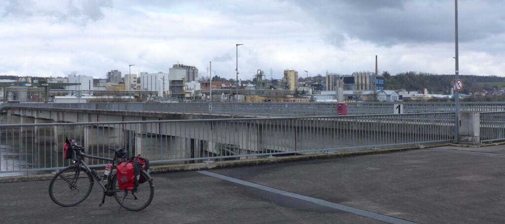 Wenn man an großen Flüssen in die Nähe von großen Städten kommt, ist es oft mit der Schönheit vorbei. So auch hier. Im engen Hochrheintal ist nicht so viel Platz und so wird es ab Rheinfelden sehr industriell. Ich überquere den Rhein zurück nach Deutschland am Kraftwerk dort.