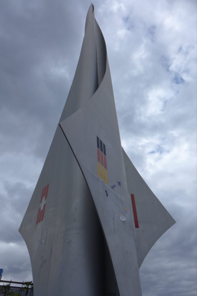 Im Norden Basels im Hafengebiet befindet sich der Dreiländerpunkt Schweiz – Frankreich – Deutschland. Der liegt allerdings mitten im Rhein und daher gibt es im Hafen Basels diese Skulptur, die mich eher an eine Rakete erinnert, als an etwas Verbindendes.