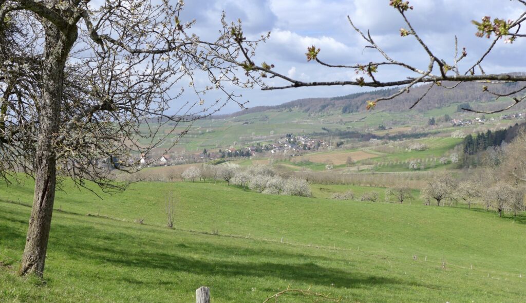 Nach zweieinhalb Tagen Rhein geht es zum Abschluss des Tages noch an den Fuß des Schwarzwaldes. Nachdem es den ganzen Tag bei Gegenwind recht frisch, aber trocken war, wagt sich jetzt sogar die Sonne hervor. Ich habe noch 200 Höhenmeter zu bewältigen, aber oben ist es schön.